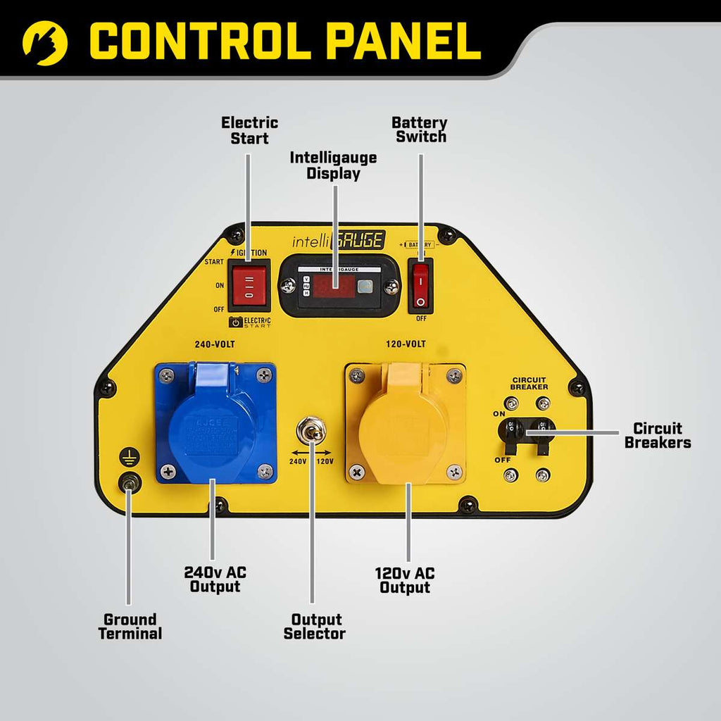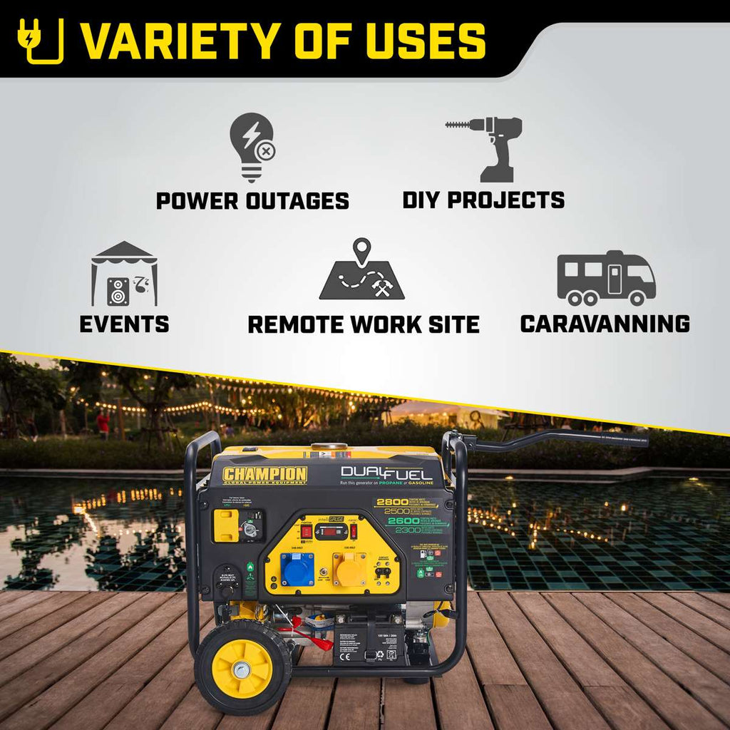 The Champion Power Equipment CPG3500E2-DF DF Dual Fuel, Petrol or LPG, portable generator, is powered by a Euro 5, 182cc Champion single cylinder, 4-stroke OHV engine that produces 2500 running watts & 2800 max watts on petrol and 2600 max watts & 2300 running watts on LPG.